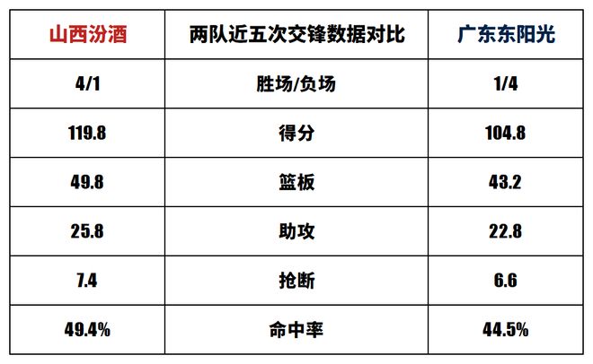 山西汾酒与广东东阳光历史上一共交手48次,山西汾酒10胜38负。上赛季两队交手7次,山西汾酒6胜1负。