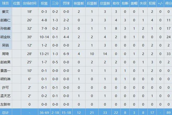 此役周琦展现出极强的统治力,28分钟里投篮21中13,爆砍33分14板;胡金秋投篮14中10,高效贡献24分4板。