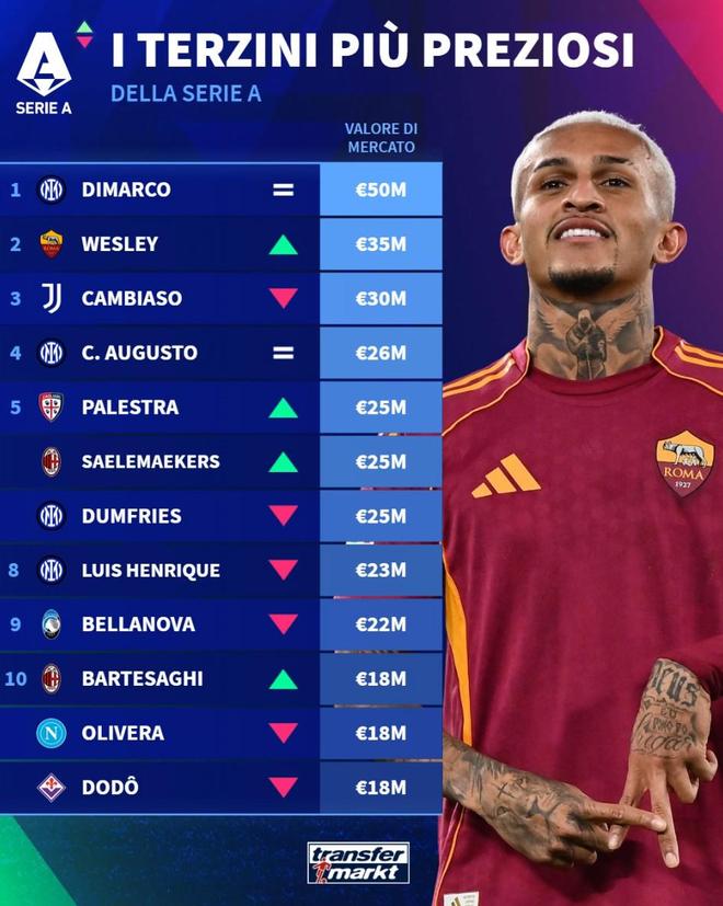北京时间12月25日,在更新了意甲球员的身价后,德转列出了目前意甲边后卫身价排名前10的球员,迪马尔科5000万欧元高居第一,韦斯利-利马3500万欧元第二,安德烈亚-坎比亚索3000万欧元第三。