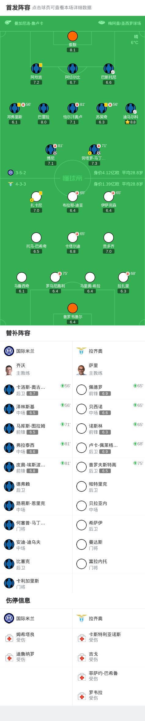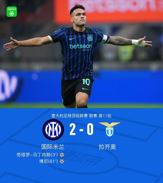 北京时间11月10日,意大利足球顶级联赛第11轮,国际米兰坐镇主场迎战拉齐奥。上半场劳塔罗开场3分钟闪击破门,扎卡尼远射造险,苏契奇失良机,下半场博尼推射扩大比分,泽林斯基低射破门被吹。最终国际米兰以2-0战胜拉齐奥,全取三分。