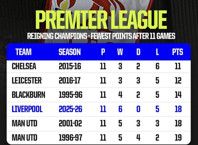 利物浦前11轮18分,英超历史仅3支卫冕冠军同期积分更少
